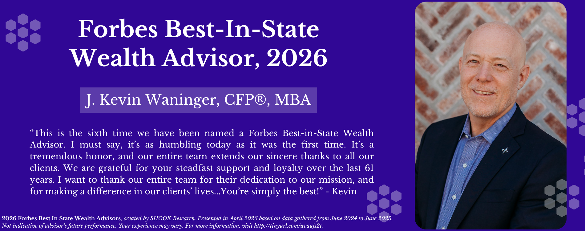 Kevin Waninger is proud to have been recognized as a Chairman's Level advisor for 2025, 2024, 2023 and 2022, and a Leaders Level advisor for 2025, 2024, 2023, 2022, 2021, and 2020—distinctions based on annual production that most recently for 2025 places him among the top 4% and 11% respectively, of advisors affiliated with Commonwealth Financial Network®.